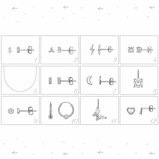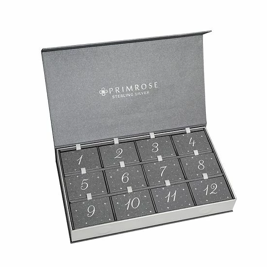 This festive PRIMROSE jewelry box contains a beautiful collection of sterling silver and cubic zirconia earrings, pendants, and necklaces, one for each day of Christmas.