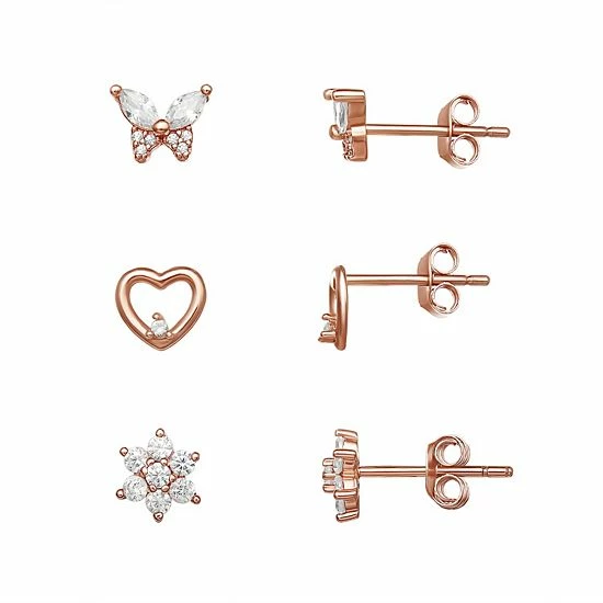 This adorable 18k rose gold cubic zirconia butterfly open heart and flower stud earring set is the perfect way to add some variety to your daily look.