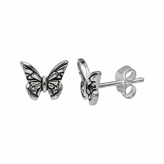 Featuring a sterling silver butterfly design and an oxidized finish, these PRIMROSE stud earrings are a charming complement to your attire.