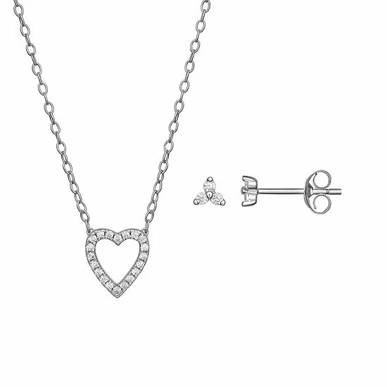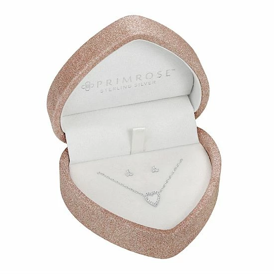 This PRIMROSE sterling silver and cubic zirconia open heart necklace and earring set is presented in a charming heart-shaped box for a gift she’ll love.