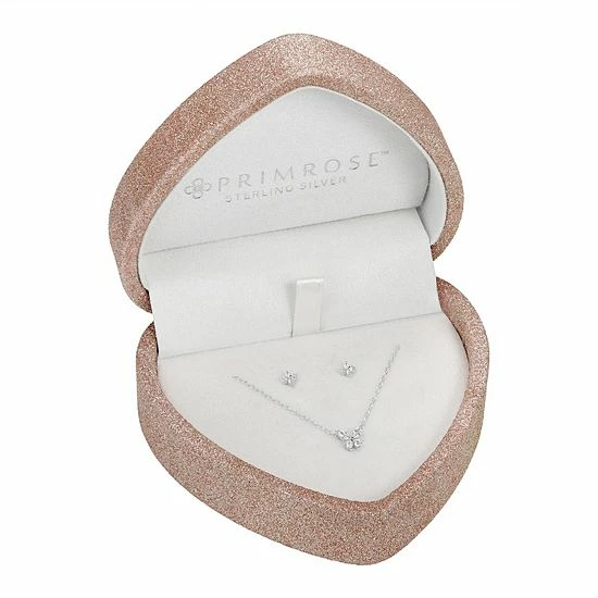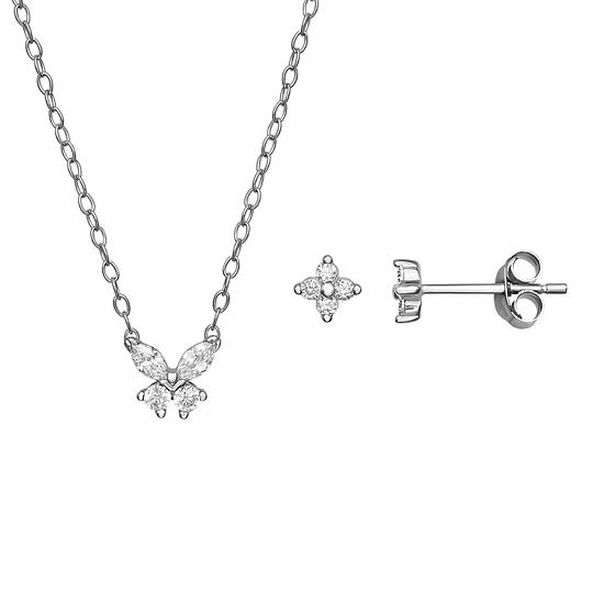 This PRIMROSE sterling silver and cubic zirconia butterfly necklace and flower earring set is presented in a charming heart-shaped box for a gift she’ll love.