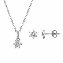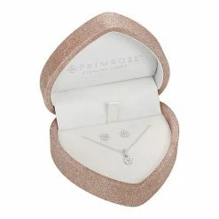 This PRIMROSE sterling silver and cubic zirconia flower necklace and earring set is presented in a charming heart-shaped box for a gift she’ll love.