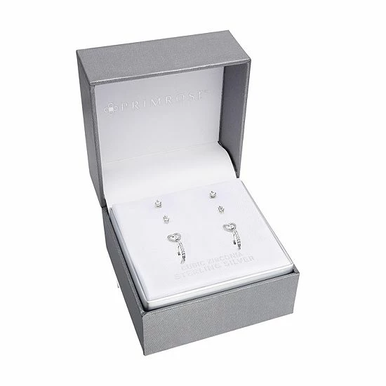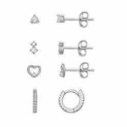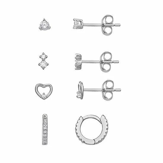 This sterling silver cubic zirconia round, double round, open heart stud and huggie earrings set is a must-add to grow your earring collection.