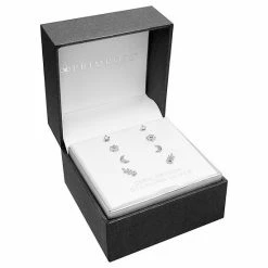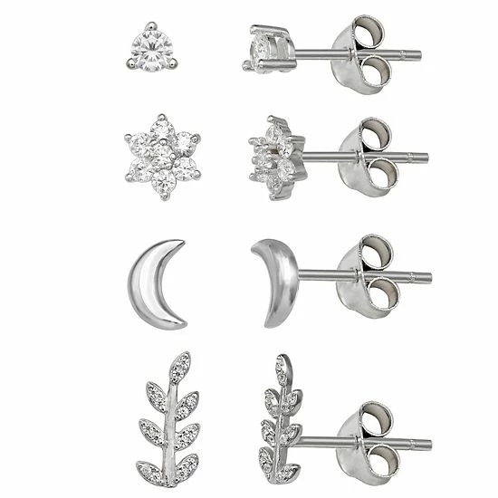 This gorgeous sterling silver cubic zirconia round, leaf, moon and flower stud earrings set is the perfect way to add something new and exciting to your earring collection.