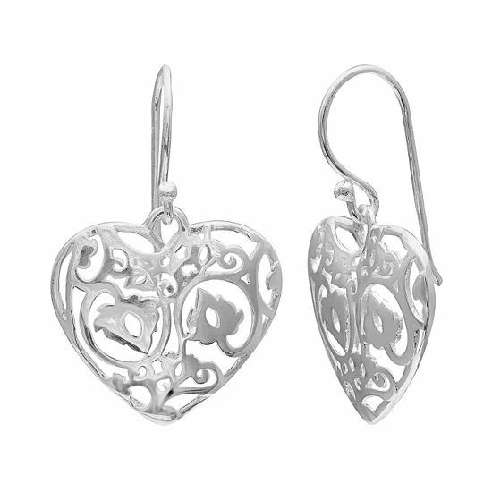 A filigree heart motif makes these drop earrings a delightful accessory.