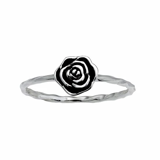 This adorable PRIMROSE sterling silver oxidized rose twisted band ring is the perfect piece to accessorize any of your favorite looks.