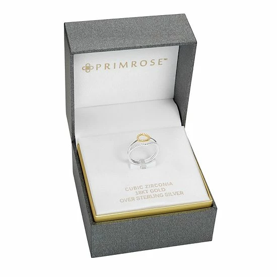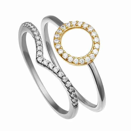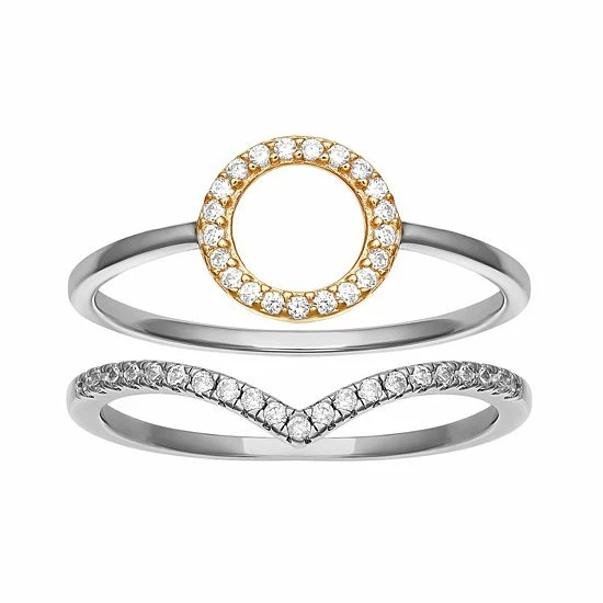 Mix and match with this set of two cubic zirconia-studded PRIMROSE rings, one of which features an 18k gold plated open circle and the other a unique v-shape.